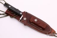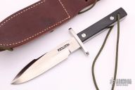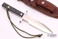 This Model 17 Astro by Randall features a satin finished spear point blade with false top edge, .222" blade stock. 1.317" blade depth, full tang construction. Black linen micarta scales, fastened with removable stainless steel bolts. A slot in the heavy tang and matching hollow inside the handle may be used to carry matches, fishhooks, line and other survival items. The Model 17 was especially designed for the seven Mercury astronauts, who carried them on America's first manned space flights. Astronaut Gordon Cooper did the final design, and two of these historically valuable knives are on display in the Smithsonian Institution. Includes brown leather sheath with stone. Excellent condition.