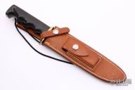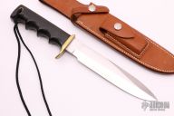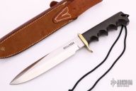 This Model 16 Diver by Randall Made Knives features a satin finished blade with sharpened top edge and notched thumbrest, .223" blade stock and 1.223" blade depth, full tang construction. The handle has a brass guard, black linen micarta finger grip handle. Comes with a brown leather sheath. Excellent Condition.