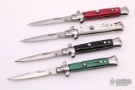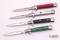 This is a lot of 4 swivel bolster autos are made by "Milano". All have satin finished blades, stainless steel bolsters, acrylic scales and steel liners. Good function. Some have some light scratches, good condition overall.