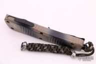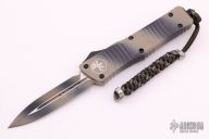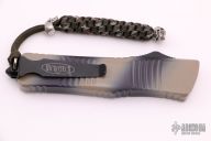 This Combat Troodon OTF automatic features a tan camo D/E blade with a standard edge and a tan camo aluminum frame. Stainless steel clip. Glass breaker. Serial number 15648 and dated 10/2015. Has some scuffs, otherwise good condition.