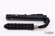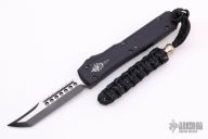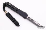 This Ultratech Hellhound by Microtech Knives features a two-tone black DLC blade with notched thumbrest and fullers, false top edge. The handle has a contoured black aluminum frame with tip down black stainless steel clip, black ringed DLC hardware, black titanium thumbslide. Has some scuffs and the tip is slightly blunted, otherwise good condition.