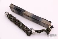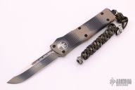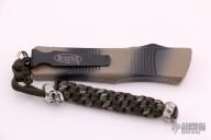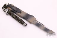 This Troodon OTF automatic from Microtech features a tan camo blade with fullers. The handle has a tan camo aluminum frame with thumb-slide and glass break, and tip down clip, all black hardware. Dated 12/2015 with a S/N of 16419. Has some scuffs and scratches, otherwise good condition.