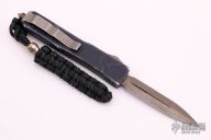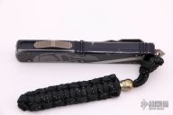 This knife by Microtech is a Molon Labe D/E Ultratech, it has a bronze apocalyptic standard blade with fullers and double edged. The handle is black aluminum with bronzed hardware and stainless steel clip and glass breaker. Has Spartan Helmet Logo on handle, handle has been distressed. Dated 08/2016