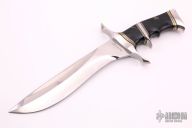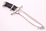 This Subhilt by Bill Luckett features a mirror polished recurve blade with sharpened top edge, .244" blade stock and 1.759" blade depth, hidden tang construction. The handle has a mirror polished stainless steel guard, sub-hilt and butt, dyed burl wood grip with black/brass/stainless steel spacers. Has a few light scratches, otherwise excellent condition.