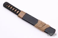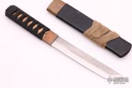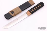 This Extra Long Kozuka by Phill Hartsfield has a double ground tanto blade with .076" blade stock and .804" blade depth, hidden tang construction. The handle has black cord wrap over copper. Includes the original paper lined, leather covered metal sheath with copper collar. Excellent Condition.