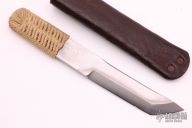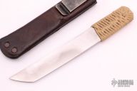 This is Kwaiken by Phill Hartsfield has a chisel ground tanto blade with .158" blade stock and .989" blade depth, hidden tang construction. The handle has epoxied cord wrap. Includes the original paper lined, leather covered metal sheath. Excellent Condition.