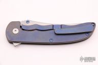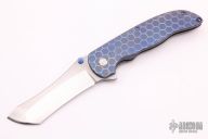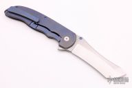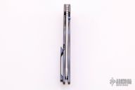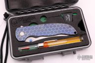 This Norseman (#1790) by John Grimsmo features a stonewashed blade with a single anodized titanium thumb stud, notched thumb ramp and flipper. Tumbled and anodized titanium frame with a reverse honeycomb pattern front scale and anodized titanium screws. Very smooth action that requires no wrist movement. Nice detent, lockup and blade seating. Rides on ceramic bearings. Knife is in excellent condition, shows no signs of use or carry. Comes with original packaging, custom hard case, Nano-Oil, tool, and COA.