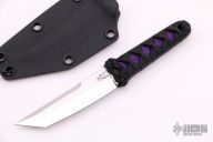 This Mini Tanto Neck Knife by Sam Eddleman features a mirror polished tanto blade with false top edge, .124" blade stock and .741" blade depth. Handle is wrapped in a traditional Japanese style using epoxy soaked nylon cord over rayskin. Knife is in excellent condition, shows no signs of use. Comes in a custom black kydex neck sheath.