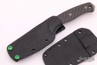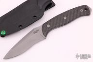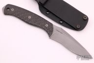 This Prototype by Doc Shiffer features a tumbled drop point blade with .126" blade stock and 1.25" blade depth, tapered tang construction. The handle features carbon fiber scales. Includes two kydex sheaths.  One sheath does not fit very well.    Excellent Condition.