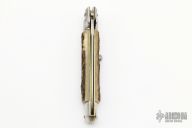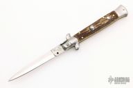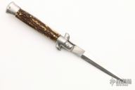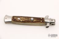 This swivel bolster auto by AB Italy features a spear point blade with a false top edge. The handle has stainless stain bolsters and butt, stag scales and brass liners. Strong opening. Has safety. Has been used and resharpened, has scuffs and scratches, has some blade play, fair condition.