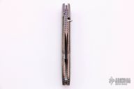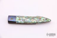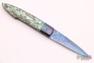 This linerlock folder by Harold Moeller features a blued Damascus blade with single thumbstud with ruby inlay. The handle has blued Damascus bolsters, abalone scales, fileworked stainless steel liners and backspacer. Nice detent, lockup and blade seating. Excellent condition.