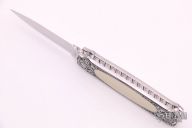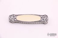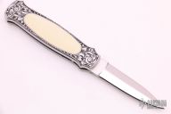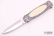 This Scale Release Auto by Steve Kraft features a mirror polished blade with false top edge and fileworked spine. The handle has an engraved stainless steel frame with mammoth ivory inlays and fileworked stainless steel backspacer. Has a couple light scratches, otherwise excellent condition.