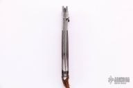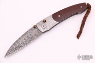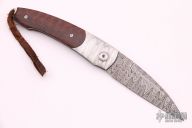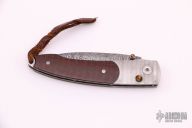 This button lock by William Henry features beautiful snakewood scales with stainless Damascus bolsters with integral liners. Stainless Damascus blade with false top edge. Tiger's Eye inlays on single thumb stud and button. Very nice work and smooth function. Strong lock up, nice detent and blade seating is dead center. Includes original box, and paper work. Excellent condition.