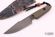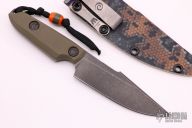 This Proton by Dervish Knives features a dark tumbled blade with a notched thumbrest and a full tang construction.  .162" Blade Stock.  1.193" Blade Depth.  The handle features OD Marble G10 scales.  Includes a kydex sheath with a mummert clip, COA and a padded zippered case.  Excellent Condition.