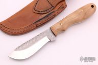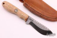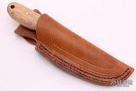 ELK4.0LE - Only 50 Made – Full Tang Hand-ground D2 Steel Blade with jeweling applied over the textured mill scale left on the blade flats. Free-hand anti slip file work applied to the top of blade spine. Hand select western shaped and polished Maple scales pinned through full tang design. Our new SILVER STAG silver medallion is inserted into handle. Leather pouch sheath with vertical and horizontal belt wear options. This is an excellent big game processing design and a collectors piece. Comes with original box, sheath and papers. Excellent condition.
