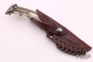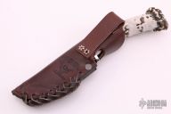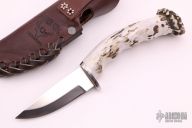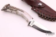 This Knife by Silver Stag features a satin finished blade with .127" blade stock and 1.076" blade depth, hidden tang construction, The handle has a stainless steel guard and finger grip crown stag handle. Comes with a hand tooled brown leather sheath. Excellent condition.