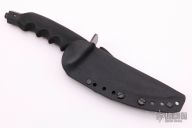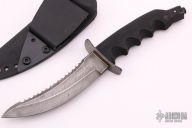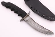 This Hobbit Warrior by REKAT features a Damascus blade with .169" blade stock. 1.222" blade depth. Serrated top edge. Double guard. Rubber handle. Black coated butt cap. Some scuffing on the butt cap. Comes with kydex sheath with belt loop. Excellent condition. Comes with original brochure.