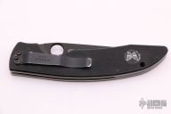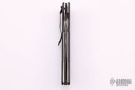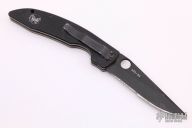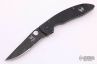 This AFCK liner lock folder from Benchmade has a spear point blade with partial serrations, thumbhole and a notched thumbrest. Handle is black G10 over titanium liners, black backspacer, lanyard hole. Black stainless steel tip down pocket clip. Has some wear on the blade finish, otherwise good condition. Comes with original box and papers.