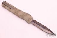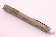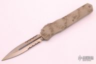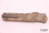 This Cypher OTF is a collaboration between Anthony Marfione and DC Monroe. It features a bronzed double edged blade with partial serrations.  The handle has a Rattlesnake finished aluminum handle with blasted hardware and titanium tip down clip and a titanium insert at the butt. Comes with original box and papers. Excellent condition.