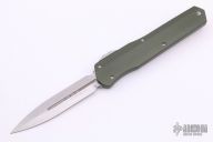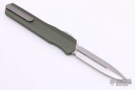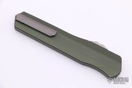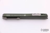 This Cypher OTF is a collaboration between Anthony Marfione and DC Monroe. It features a stonewash double-edged blade with standard edges. The handle has a OD green aluminum handle with bead blasted hardware, and a titanium tip down clip and a titanium insert at the butt. Comes with original box.   There are several light scratches on the handle otherwise the knife is in excellent condition.  S/N 1919.  Dated 04/2018.