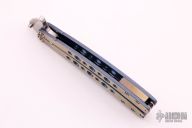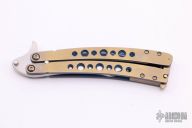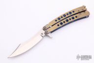 This Gargoyle V2 balisong by Terry Guinn features a satin finished blade. The handles are two-tone anodized titanium with a matching spring latch and backspacers. Features IKBS. Marked "Terry Guinn CG-012" inside spacer. Comes with zippered case. Excellent condition. 12 of 20 that were made.