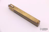 This rare Kelgin balisong has a satin finished drop point blade. The handle has brass handles with wood inserts. Great lockup in closed position. Has some scratches and patina, has been resharpened, fair condition. Comes with nylon belt sheath.
