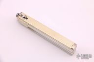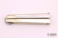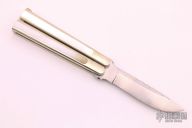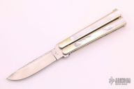 This rare Kelgin balisong has a satin finished drop point blade with fileworked spine. The handle has nickel silver handles with mother of pearl inserts. Great lockup in closed and open positions. Has some light scratches, otherwise excellent condition. Comes with nylon belt sheath.