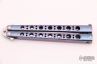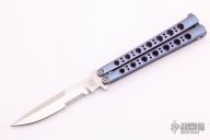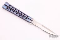 This Model 42AS Balisong features a satin finished partially serrated blade and anodized titanium handles with an orange peel finish. Has T-latch. Includes original sheath. Excellent condition.