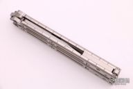 This Basilisk R Ti from HOM Design features a satin finished recurve clip point 154 CM blade with swedge. The handle is comprised of satin finished titanium scales over stainless steel backspacers, tip up titanium clip, steel and titanium T latch in pommel. Includes Maker's card, and original box. Excellent condition.
