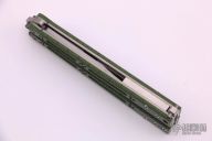 This Basilisk R from HOM Design features a satin finished, recurved clip point blade with swedge. The handle is comprised of green/black carbon fiber scales over titanium liners and stainless steel backspacers. Steel and titanium T latch in pommel. Includes Maker's card and original box. Excellent condition. 1 of 50 made.