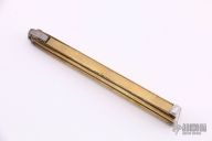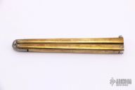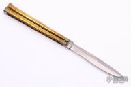This balisong from the Philippines features a clip point blade with a satin finish and false top edge. The handle has brass scales and brass channel construction, aluminum T-latch. Has scratches and patina, but that is normal for these. Excellent condition.