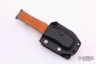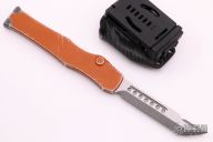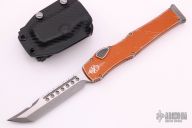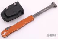 This Halo VI by Microtech Knives features an Apocalyptic finished Hellhound blade with satin flats and notched thumbrest. The handle has a distressed orange aluminum frame and Apocalyptic finished titanium charging handle. No safety. Comes with a kydex sheath with belt clip, original box and papers. Dated 12/2018 and s/n 001. Excellent condition.