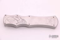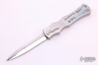 This Burn Custom Razor OTF has a mirror polished hollow ground double-edged blade. The chassis is cut from 416SS, has presentation grade Abalone inlays. Blade deploys with authority and locks up tight with minimal blade play. Has a couple scratches, otherwise excellent condition.