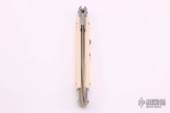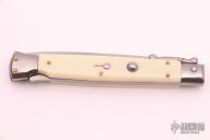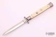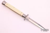 This 11" Swing Guard Auto by Frank Beltrame features a polished dagger ground blade with false top edge. The handle has stainless steel bolsters, front and rear, white synthetic scales, brass liners, stainless spring. Excellent condition.