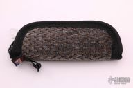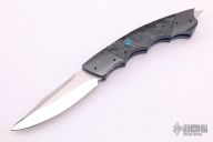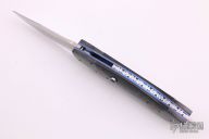 This knife by Burn Knives features a two-tone blade with mirror polished grinds and satin finished flats. The handle has zirconium bolsters, black pearlex scales, abalone push button, anodized titanium liners, fileworked stainless steel backspacer. Comes with a zippered case. Excellent condition.