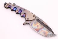 This M-F fixed blade by TS Heeter features a temper color finished CPM3V blade with notched thumbrest and milled fullers, .280" blade stock and 2.316" blade depth, modular construction. The handle is two slabs of multi-color anodized titanium and a CPM3V backspacer at the butt with skull crusher and jimping. #187 on the handle. Excellent condition.