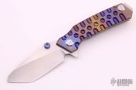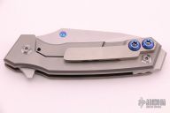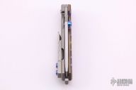 This Rogue Shark by Skike Knives features a matte finished blade with single thumbstud and flipper. The handle has an anodized and bead blasted titanium frame with a matching tip up clip, stainless steel floating backspacer. Nice detent, lockup and blade seating. Excellent condition.