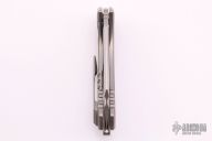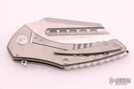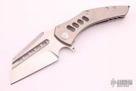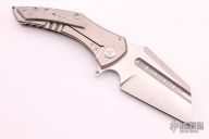 This Spectre by Sergey Rogovets features a two-tone blade with fullers, notched thumbrest and flipper. The handle has a stonewashed titanium frame with mess underlay, zirconium backspacer, tip up stonewashed titanium clip. Excellent condition.