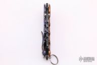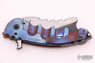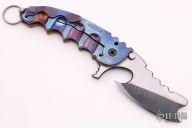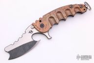 This Man of War flipper by TS Heeter features a blade with notched thumbrest and flipper. The handle has an anodized titanium and copper frame with tip up reversible titanium clip, black oxide finished stainless steel backspacer. Has a pin with split ring in the butt that can be used to lock the blade open, or it can be removed to reveal a lanyard hole. Nice detent, lockup and blade seating. Excellent condition.