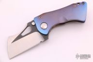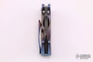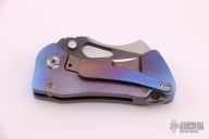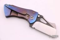 This custom framelock from Damjan Knives features a two-tone blade with satin finished grinds and black flats. The handle is crafted from titanium that has been orange peel finished and anodized. The matching titanium pocket clip is positioned for tip up carry. Blade is centered when closed and locks up with no play. This piece is in excellent condition and shows no signs of use or carry.