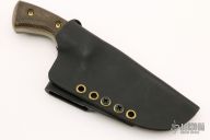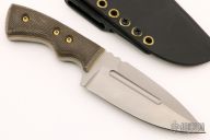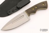 This knife by A2D Mercantile features a matte finished blade with false top edge and notched thumbrest and fullers, .204" blade stock and 1.513" blade depth, full tang construction. The handle has canvas micarta scales with brass liners and screws. Comes with a kydex sheath with a belt clip. Excellent condition.