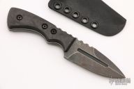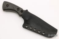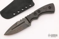 This knife by A2D Mercantile features an acid tumble finished blade with false top edge and notched thumbrest and fullers, .268" blade stock and 1.134" blade depth, full tang construction. The handle has marble carbon fiber scales. Comes with a kydex sheath. Excellent condition.