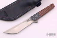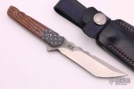 This tanto by RSK features a satin finished blade with swedge, notched thumbrest, .185" blade stock and 1.118" blade depth, full tang construction. The handle has blue paper micarta bolsters with white stars and red/white paper micarta scales all over white G-10 liners. Comes with a blue leather sheath. Excellent condition.