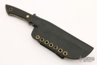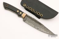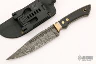 This knife by A2D Mercantile features a Chad Nichols San Mai Damascus blade with false top edge, fullers and notched thumbrest, .223" blade stock and 1.215" blade depth, full tang construction. The handle has mokume bolsters, black canvas micarta scales with brass pins. Comes with a kydex sheath with a TekLok. Excellent condition.