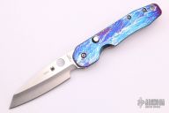 This Smock by Spyderco has a satin finish sheepsfoot style blade. The handle features custom anodized titanium scales over stainless steel liners with a reversible anodized titanium tip up pocket clip. Comes with original box, carbon fiber scales and paperwork. Excellent condition.
