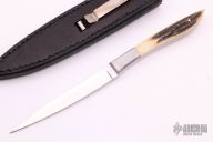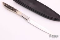This fixed blade from John Salley features a satin finish drop point blade with .121" blade stock and .586" blade depth, full tang construction. The handle is comprised of dovetailed stainless steel bolsters and stag scales. Comes with a black leather sheath. Excellent condition.