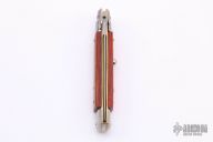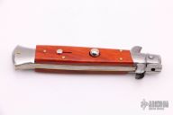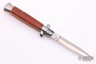 This Swivel Bolster Auto has a stainless steel spear point blade. The handle is composed of a steel front and rear bolsters, brass liners all complemented by wood scales. Excellent Condition.