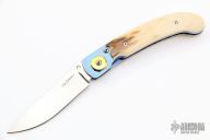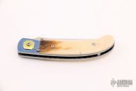 This linerlock folder by RB Johnson features a hand rub satin finished blade abalone inlays in place of the thumbstud. The handle mammoth ivory scales, anodized titanium liners and pivot collars. Great looking materials. Nice lockup and detent. Has a few very light scratches, otherwise excellent condition.