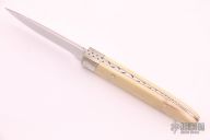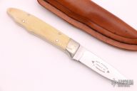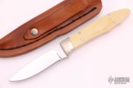 This Utility by Les Voorhies features a mirror finished blade with .111" blade stock and .704" blade depth, full tapered tang construction with nickel silver bolsters and mammoth ivory scales. Has a fileworked tang Comes with a brown leather sheath. Has some patina on the bolsters, otherwise excellent condition.