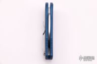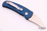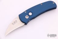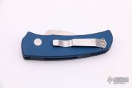 This Stingray side-opening automatic by DKD has a satin finished hawkbill blade and blue aluminum handle. California legal. Coil spring. Has a tip up clip. Has some scuffs, otherwise excellent condition.